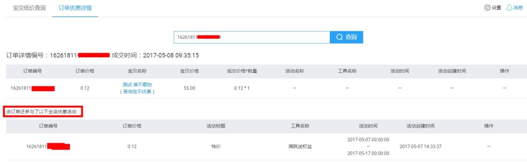 进入【卖家中心】-【营销中心】-【店铺营销工具】-【优惠监控】里操作查询,支持以宝贝ID、订单ID为维度查询优惠信息。