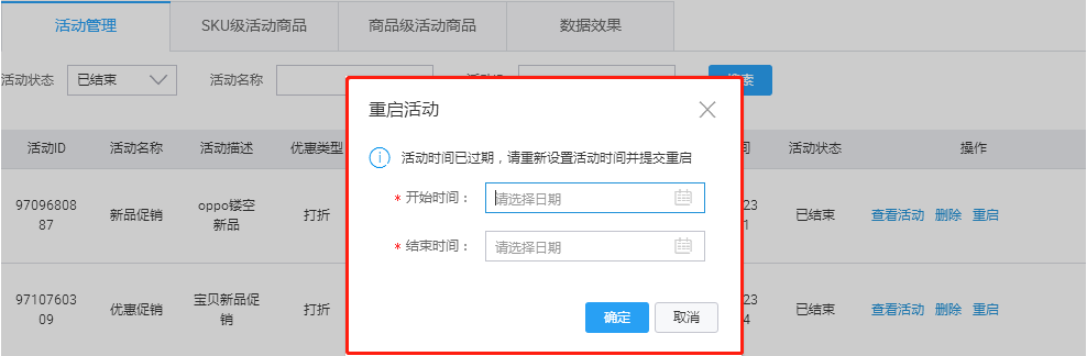 3.对于已经结束的活动,可以选择重启并重新选定活动时间