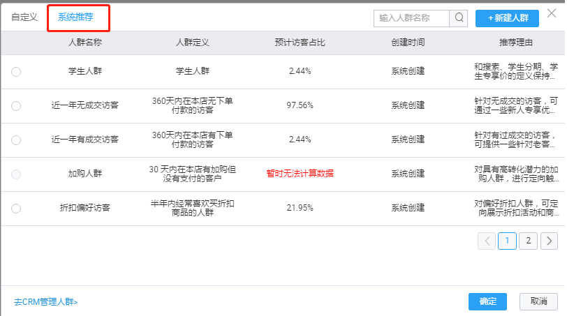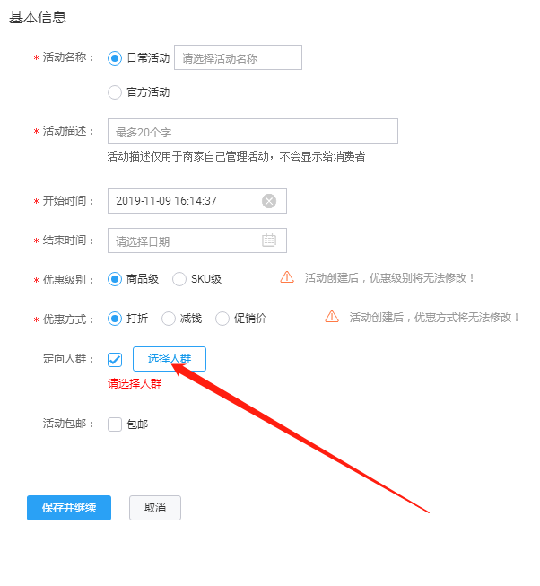 活动描述消费者看不到,仅用于商家自己管理活动,这里就可以写方便自己区分活动的描述啦,选择时间(活动时间最长可设置180天),选择优惠级别,选择优惠方式(打折,满减,促销价可以任选一个进行),记住活动创建后优惠级别和方式无法更改,所以做好决定再设置活动,设置好活动你可以选择定向人群了,你可以选择系统推荐也可以新建人群,针对这部分人群给到他们优惠,如果想给所有买家优惠就直接取消定向人群就可以了