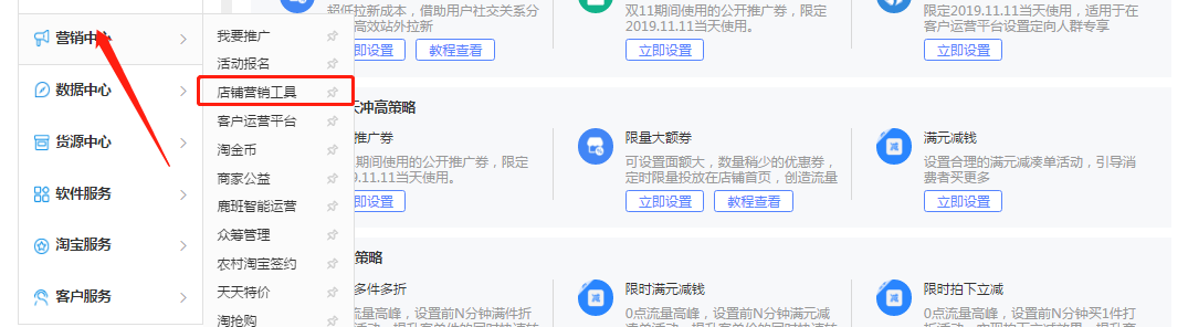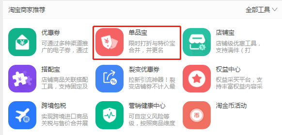 点击【卖家中心】-【营销中心】-【店铺营销工具】,在淘宝商家推荐里面可以看见单品宝工具