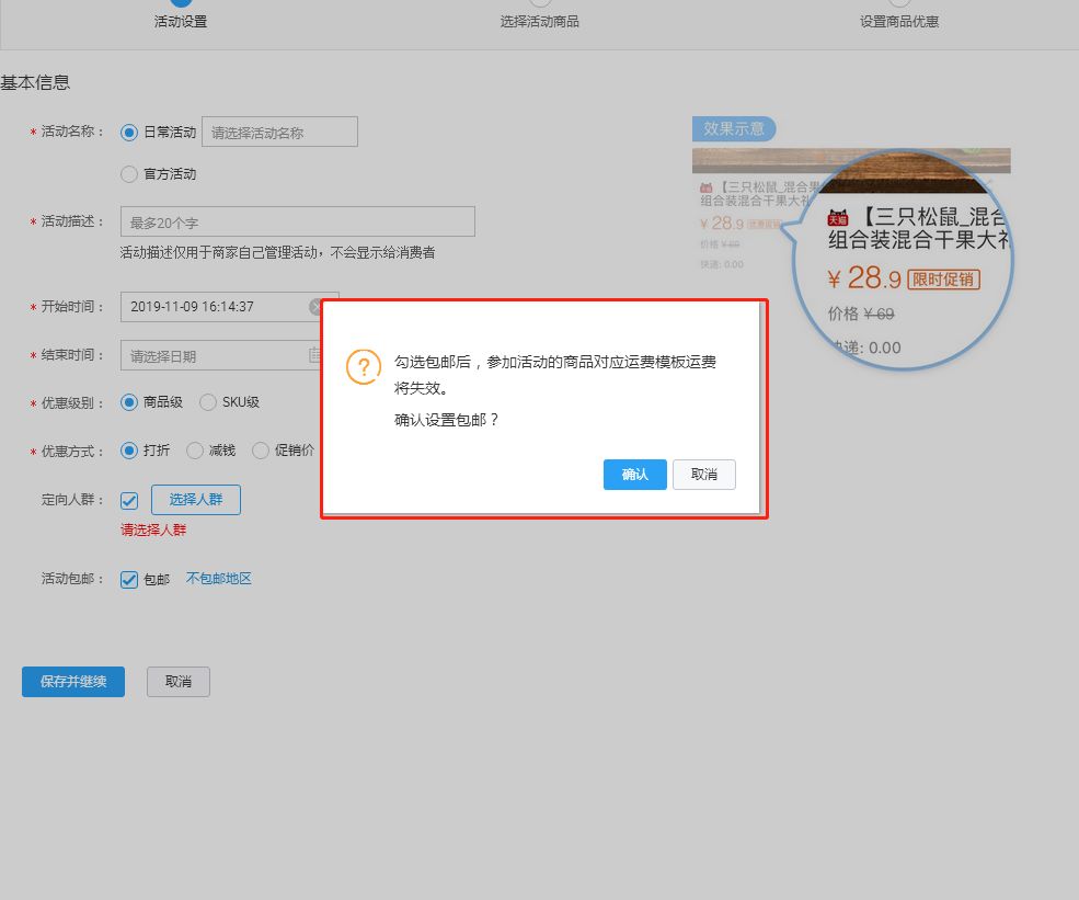 需要注意的是勾选包邮后,之前设置的运费模板失效