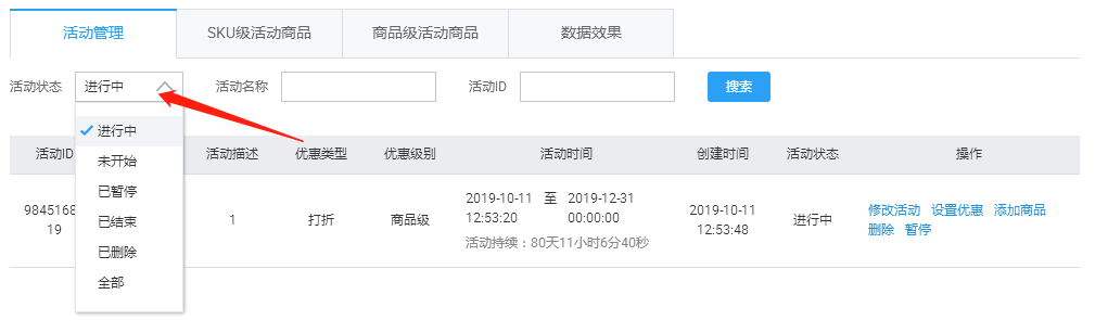 1.活动创建完毕后,选择活动状态下拉列表,找到对应活动