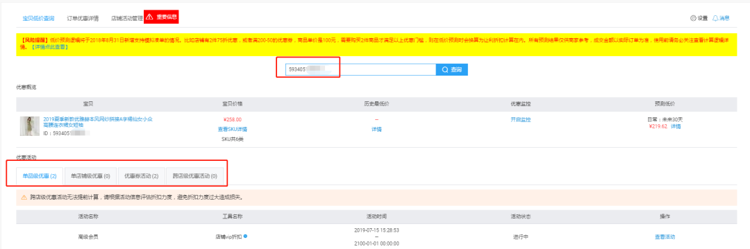 1、输入宝贝ID,查询宝贝设置的优惠活动(包括正在生效,马上要生效的)。
