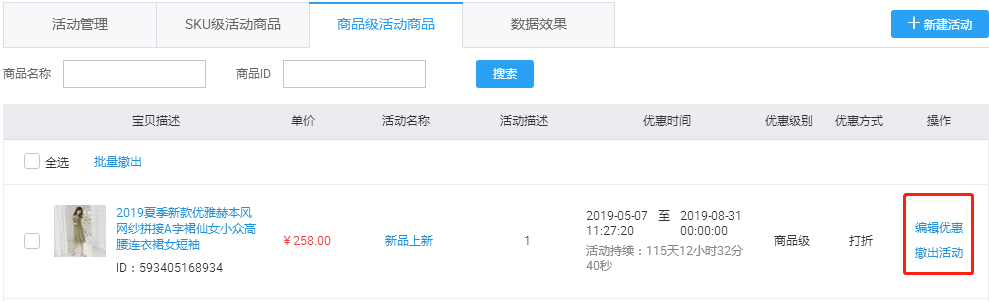 可针对活动中和未开始的商品,进行优惠编辑和撤出活动