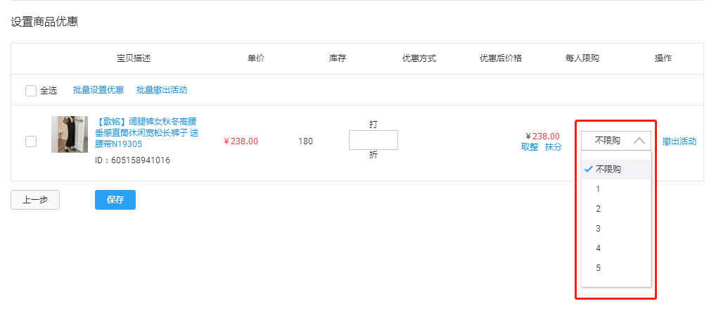 如果是商品级活动,还可以选择限购。这里可以依据卖家自身的情况设置是否限购,在这里建议商品可以赚到钱的情况下不要设置限购。如果是优惠力度大,一定要设置限购,不然可能出现亏本的情况。