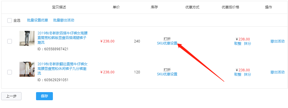 如果新建的活动是SKU级商品活动,选择商品后可以看见SKU优惠设置,点击后就可以针对商品不同的款设置活动价了