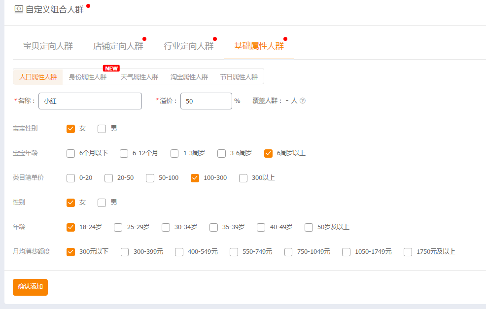 打个比方说,小红是一个20岁爱买化妆品衣服的女大学生消费在200-300之内,那么这个就是小红的标签,淘宝就会自动的给她推送200-300之内的衣服或者化妆品。如果你是卖家卖的就是服饰或者化妆品,这是你的标签,你针对的就是小红这一类的人群,那么你的关键词要开的就是新款裙子化妆品,并且调整基础属性人群为单价100-300,性别女,18-24岁,月均300以下,调整好了精准人群后。并把溢价开到50%,就等于我们比其他的卖家多50%的几率展现在小红面前。