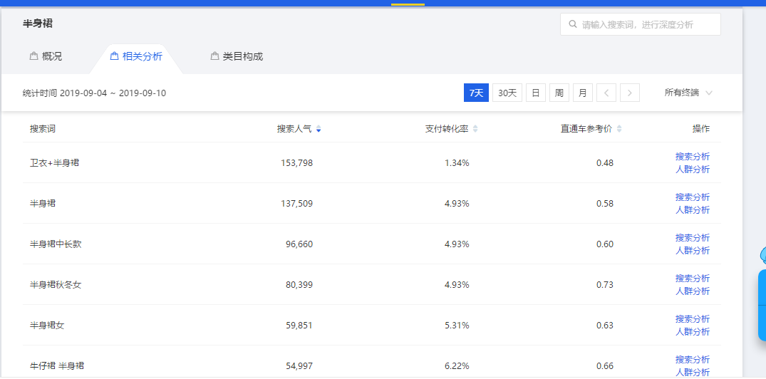 然后呢,我们打开相关分析,把时间调节为7天,这样的话,比看单日的数据要来的好,因为偶然性不大,也比看一个月的数据来的好,因为不会因为季节的原因导致数据误差大!