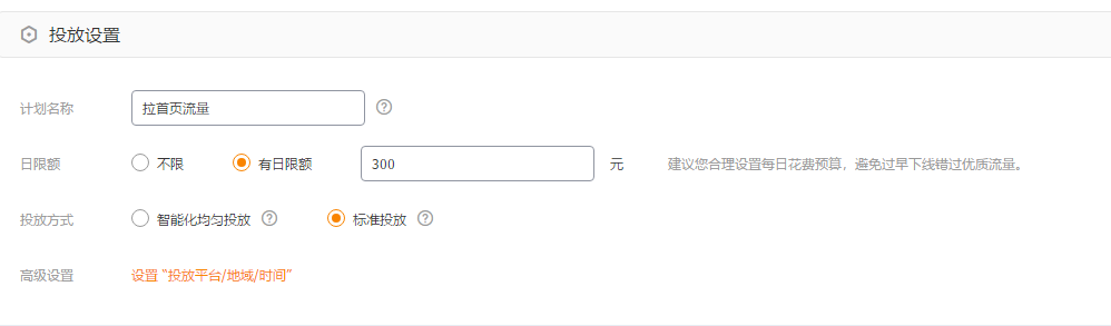 计划名称可以设置成,比如“9.15号拉首页流量计划 ”等等。这个不重要,日限额的话,根据你的预算去决定,和你的行业PPC去决定,投放的方式选择标准投放,不要选择智能化均匀投放。然后高级设置里面,如何设置,我之前分享的文章有阐述,感兴趣的商家朋友可以去翻阅下。