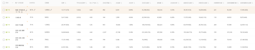 从我的截图上看,这个直通车实际上是重点推广了一个款,同时也加上两个副推广计划。主推款,我用了不同的多个计划同时进行了推广,每个计划的推广方向是相对独立的。